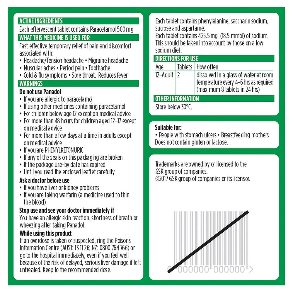 Panadol Rapid Soluble are lemon flavoured effervescent tablets and absorbed twice as fast as regular Panadol tablets. Panadol Rapid Soluble Effervescent Tablets are used for the fast, effective temporary relief of pain and discomfort associated with headache, muscular aches, period pain, toothache, migraine headache, colds & flu, and tension headache.